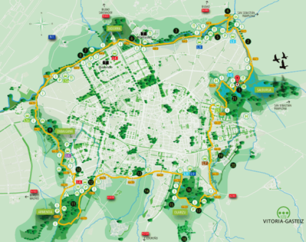 El Anillo Verde es un conjunto de parques periurbanos que rodean la ciudad, se trata de un recorrido de aproximadamente 31 km que haremos en bicicleta y que nos permitirá disfrutar de un entorno con alto valor ecológico y paisajístico sin salir de la ciudad.